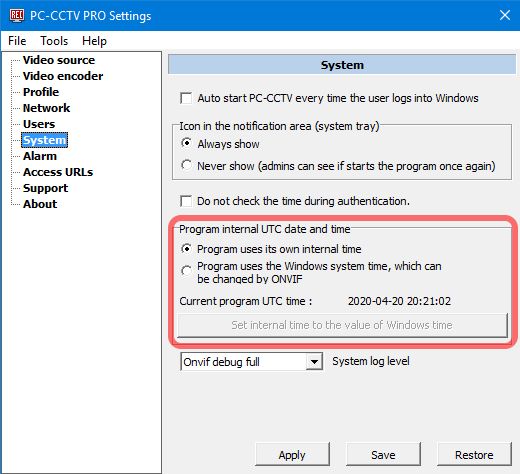 - Open Section "System" in the PC-CCTV program and set option "Program uses its own internal time".